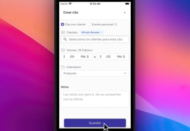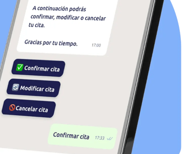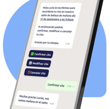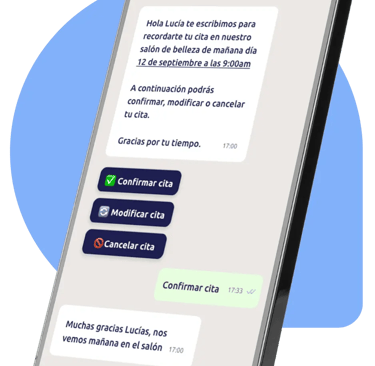 24 horas antes de la cita, nuestro sistema le mandará un mensaje por WhatsApp a tu cliente para confirmar la cita.